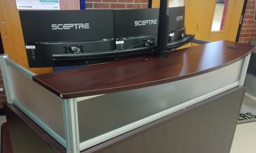 Custom built security guard stations with multiple high resolution monitors allow for easier monitoring of locations with a larger numbers of cameras. Stations are built to be mobile, allowing them to be easily relocated if needed. Computers and controls are stored safely inside a security box built into the station's desk.